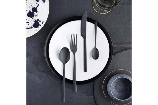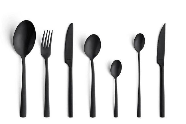 Make a statement with the Amefa Manille All You Need 9035 cutlery set 42-piece. A bold matt-black cutlery set. The Amefa Manille cutlery is enhanced with flat handles which makes the whole look sleek and modern. Made from 18/0 stainless steel with a thin PVD (Physical Vapor Deposition) titanium coating.