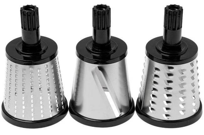 This GEFU Transforma rotary grater attachment was specifically designed for the GEFU Transforma meat mincer. With this set you can easily transform your meat mincer into a rotary grater. For grating vegetables, fruits, nuts, chocolate and cheese. The attachment set is comprised of a pusher and three different drums. These are ‘LASER CUT’ so extra sharp. For fine flakes, coarse gratings, or thin slices.