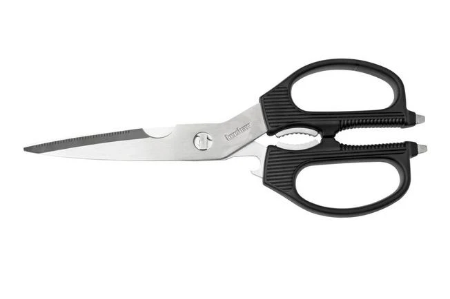 The Kershaw Taskmaster is a versatile and multifunctional pair of scissors. In the garage, in the garden, in the kitchen or at your workplace. The Taskmaster feels at home everywhere. In addition to the scissors, the Taskmaster has some useful functions. These scissors contain a nutcracker, flathead screwdriver, lid opener, bottle opener, and a bone notch that you can use to cut the bones or joints of poultry. This bone notch also functions as a cigar cutter.