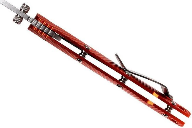 The Kizer Sunburst is a strong, lightweight pocket knife. The luxurious packaging and the included pouch are a sight to behold. It also comes with a very practical cleaning cloth. The blade is made from CPM SV35VN and is razor-sharp upon delivery. This is a type of powder metallurgical steel that can easily be sharpened until razor-sharp. The tough stonewashed finish on the blade masks any traces of use. Thanks to the thin aluminium frame, the knife weighs next to nothing. The nested steel liners add strength to the frame. The jimping on the spine of the blade and the stunning sunburst pattern on the handle provide plenty of grip. Both sides of the blade have thumb studs that you can use to easily open the blade. There is a liner lock to lock the blade.