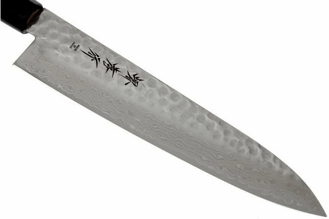 The 21 cm chef’s knife from the 45-layer Damascus collection from Sakai Takayuki. This chef’s knife, also called a gyuto, is the medium-sized knife out of three chef’s knives from the collection.