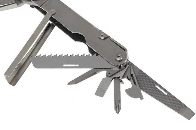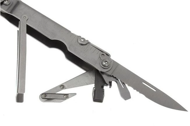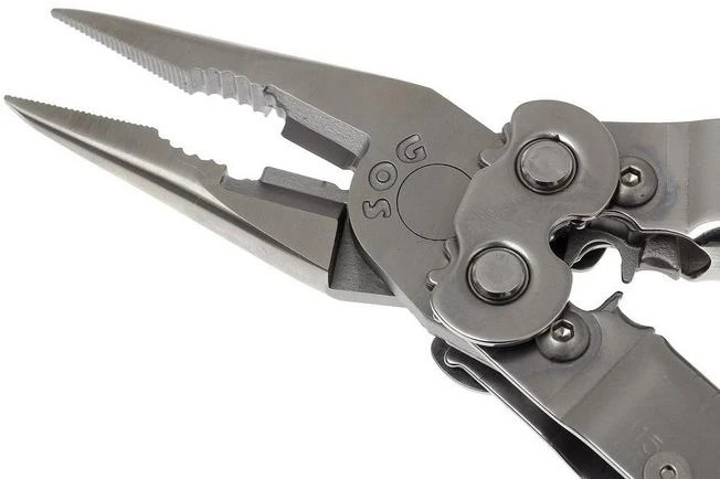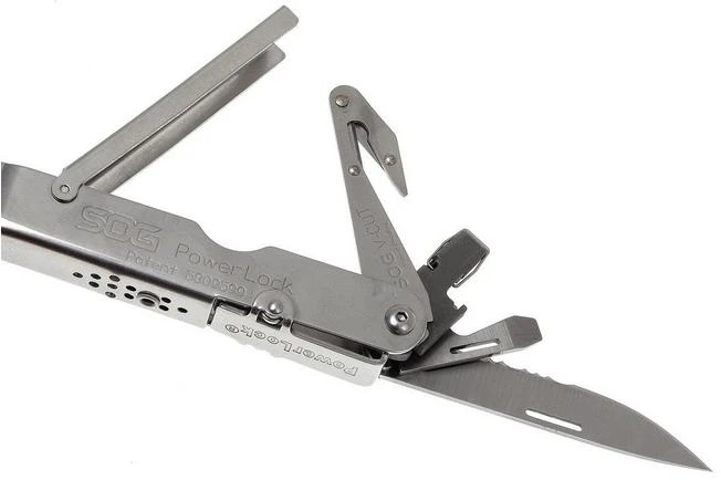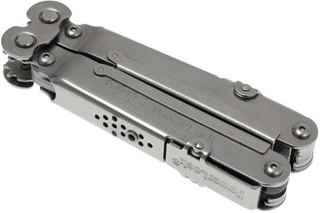 The SOG Powerlock S62 is a very complete multitool with 18 tools. The hinge of the pliers is serrated so you can put more force on the pliers. SOG has named this Compound Leverage. The 1/4 “driver on this tool is very convenient because you can use the 1/4” connection on wrench caps. Hardness: 51-53 HRC.