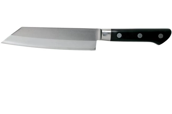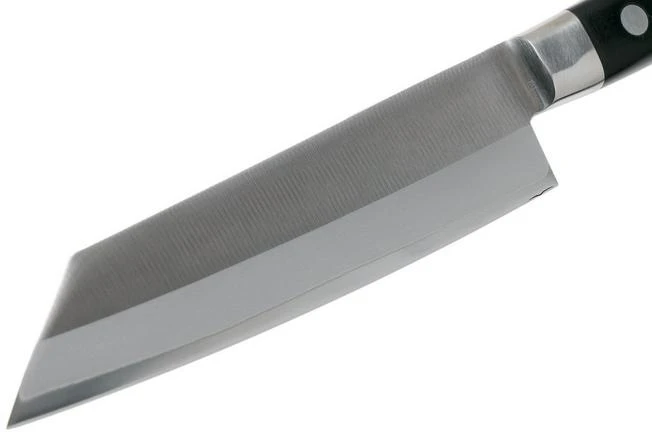 This Tojiro DP 3 bunka is enhanced with a kengata blade. This stands for ‘sword-like’ and refers to the suddenly sharply sloping end of the blade. Other than that the knife can be regarded as a member of the santoku family. With the narrow tip you can finely cut meat, fish and vegetables. Please note: not suited to cut through bones.
