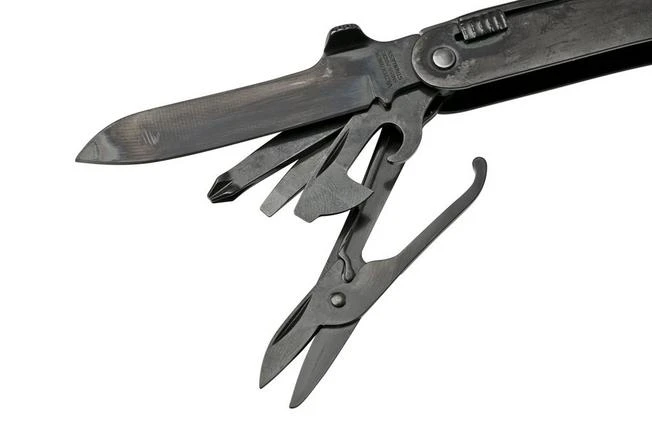 awl, bottle opener, file, knife, pliers, pry bar, saw, scissors, scraper, screwdriver, small screwdriver, tin-opener, wire cutter, wire stripper, Philips driver